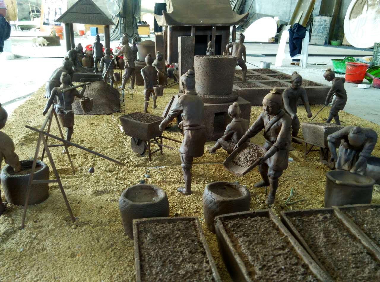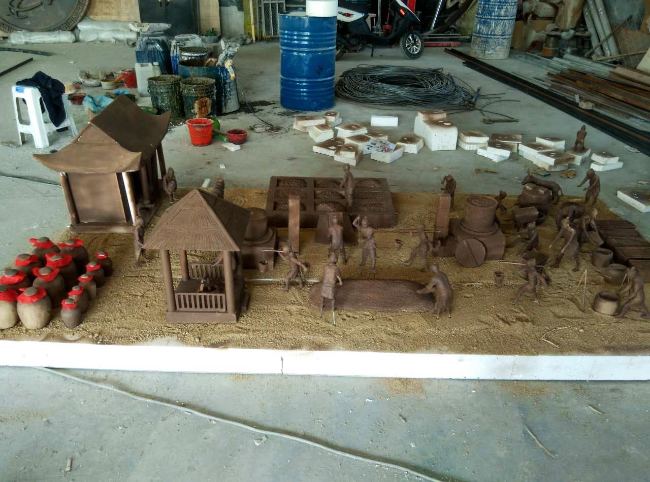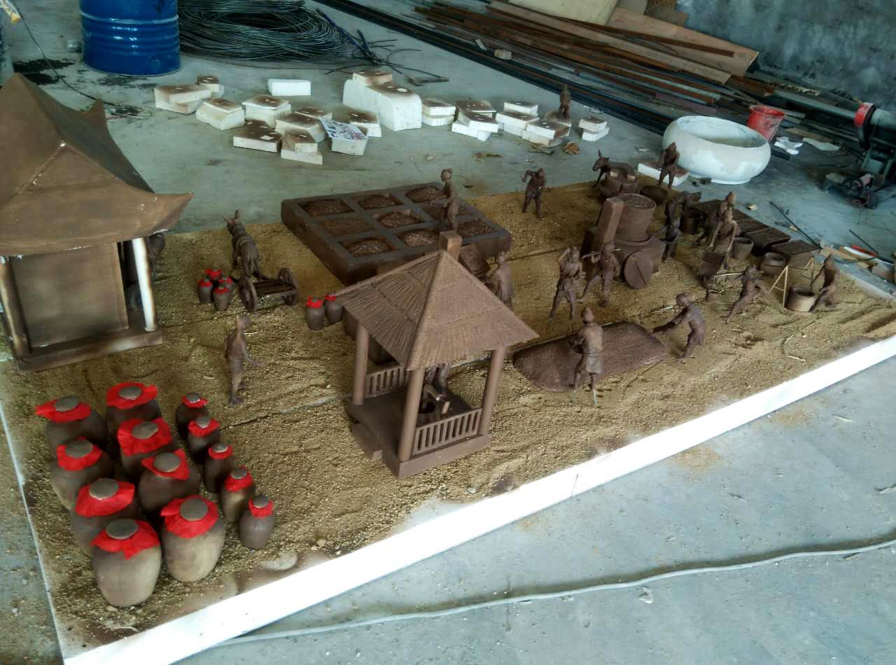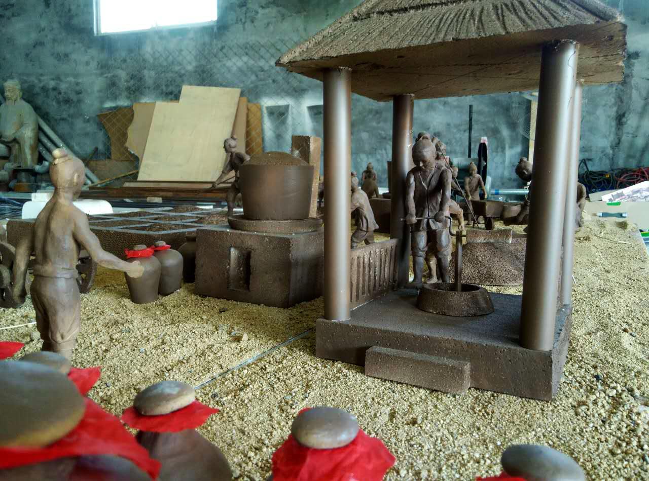 作品簡(jiǎn)介:用群雕的形式再現(xiàn)來了中國傳統(tǒng)的釀酒工藝和壓榨花生油工藝。作品中人物材質(zhì)為泥塑,更能傳統(tǒng)、民俗、古樸的風(fēng)格。
