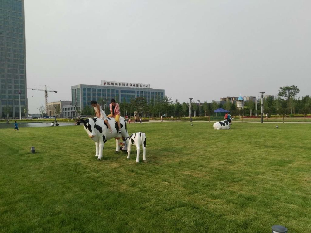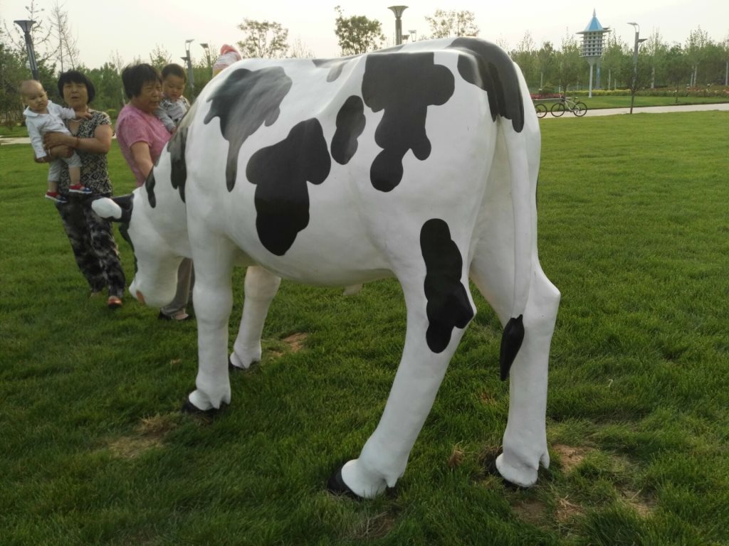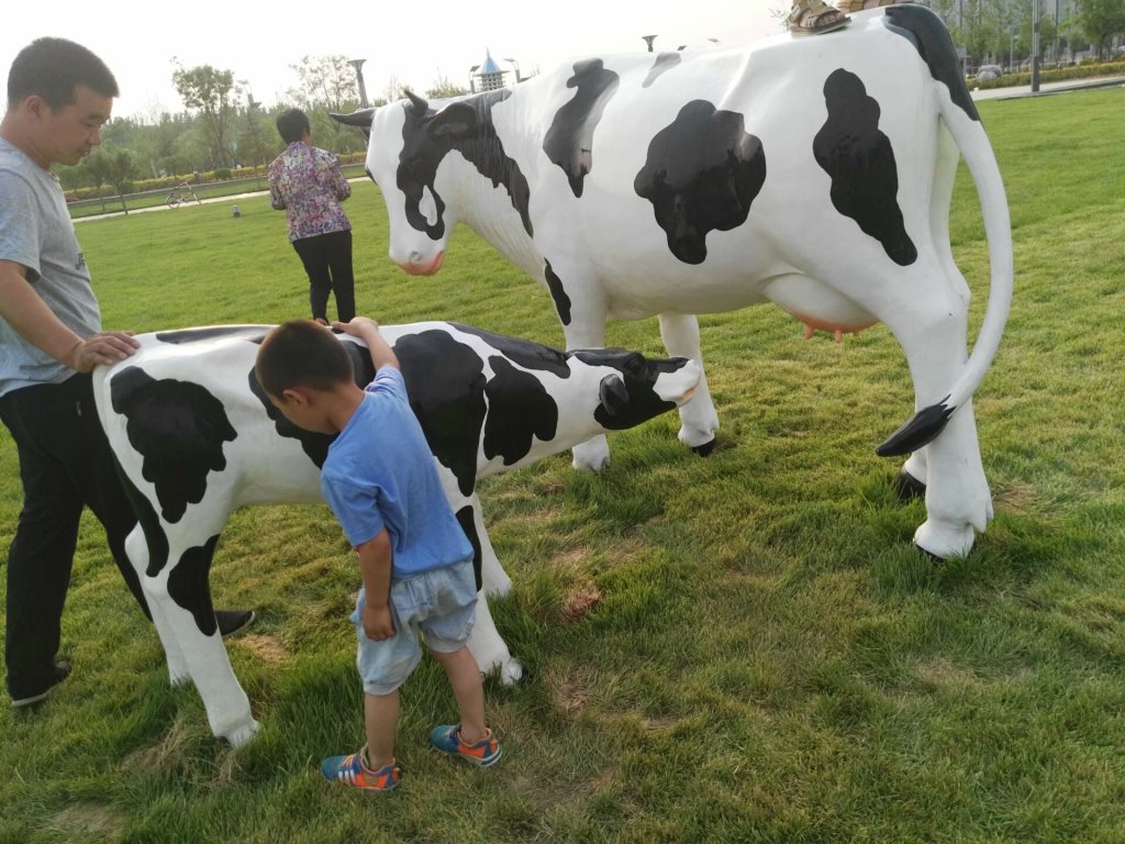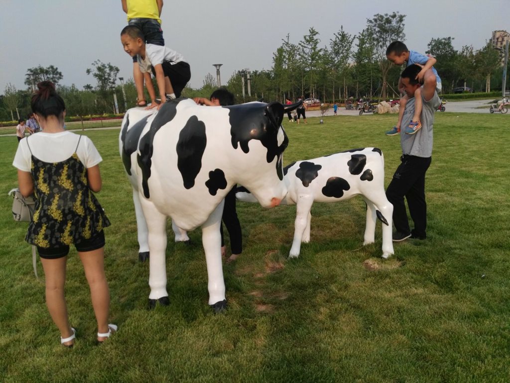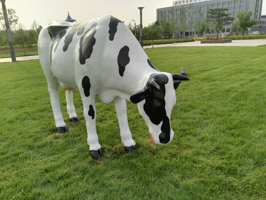 雕塑說明:奶牛雕塑共5個(gè),全部玻璃鋼材質(zhì)。本雕塑由我公司自主設(shè)計(jì),五個(gè)奶牛雕塑形態(tài)各異,相互照應(yīng),可以說成是一組奶牛群雕。雕塑全部采用寫實(shí)風(fēng)格,表面手工彩繪,形象逼真、造型準(zhǔn)確,神態(tài)寧?kù)o、祥和、自如。安裝于山東省濱州市高新區(qū)政府前廣場(chǎng)。