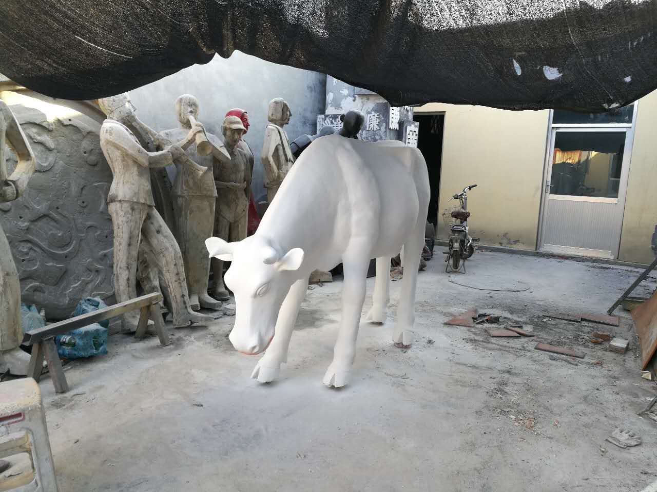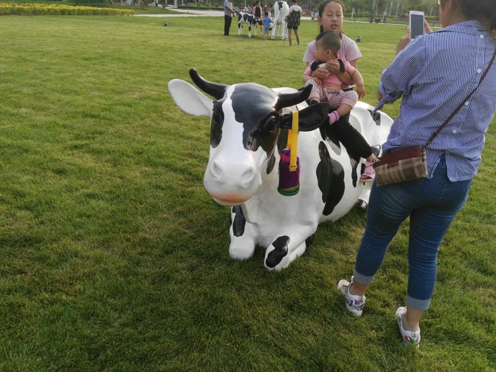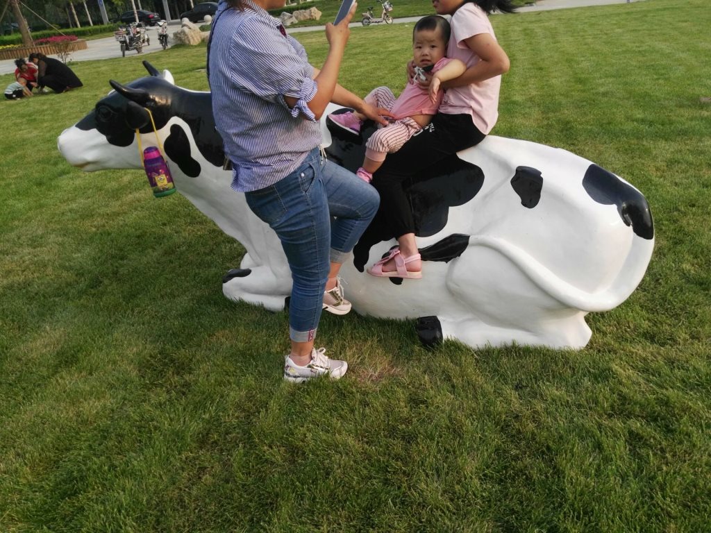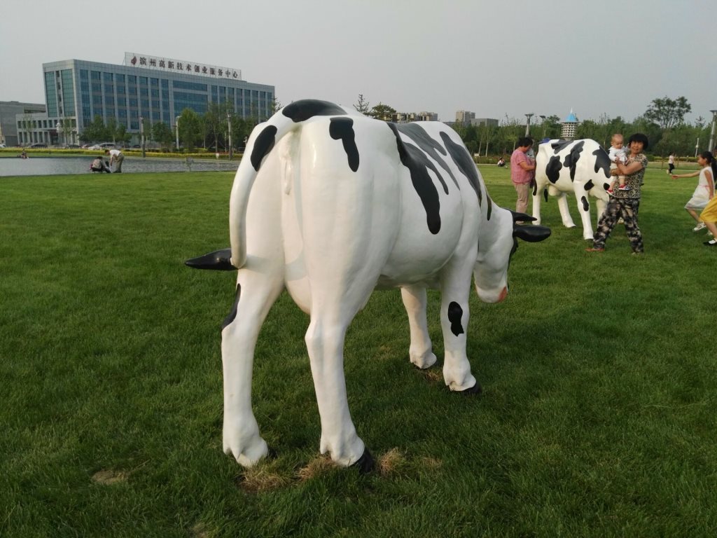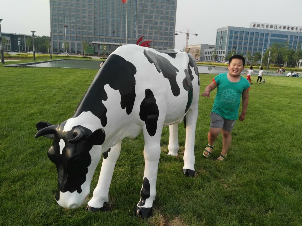 雕塑說明:奶牛雕塑共5個(gè),全部玻璃鋼材質(zhì)。本雕塑由我公司自主設(shè)計(jì),五個(gè)奶牛雕塑形態(tài)各異,相互照應(yīng),可以說成是一組奶牛群雕。雕塑全部采用寫實(shí)風(fēng)格,表面手工彩繪,形象逼真、造型準(zhǔn)確,神態(tài)寧?kù)o、祥和、自如。安裝于山東省濱州市高新區(qū)政府前廣場(chǎng)。