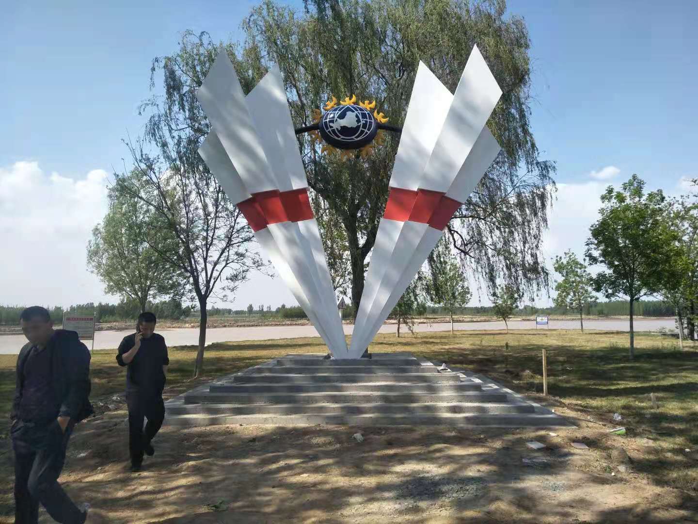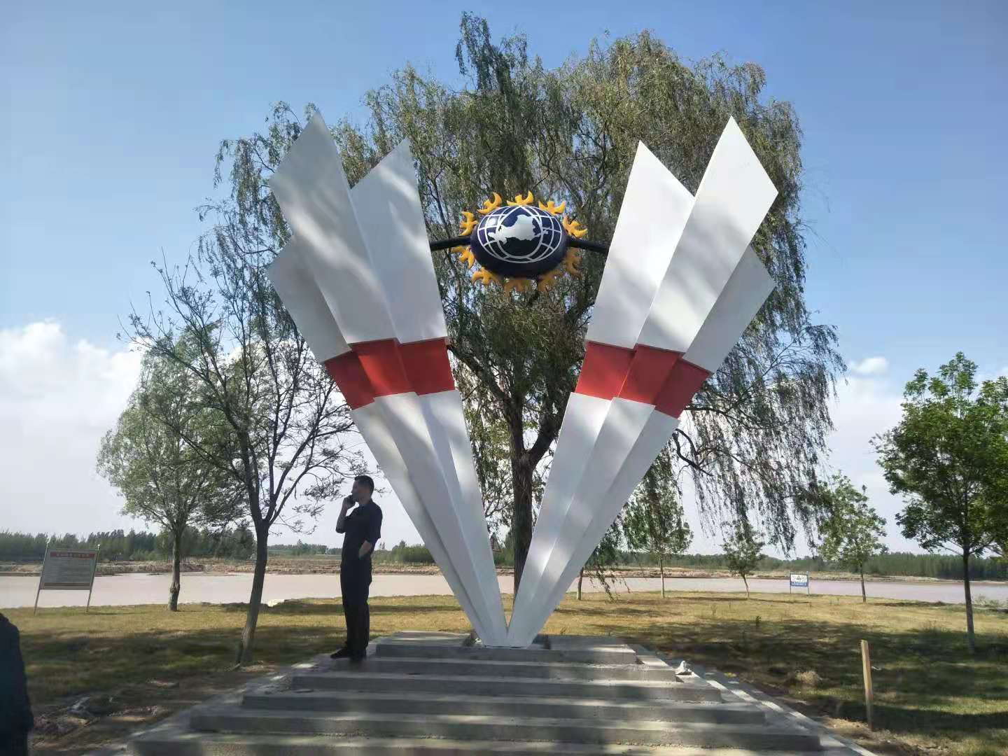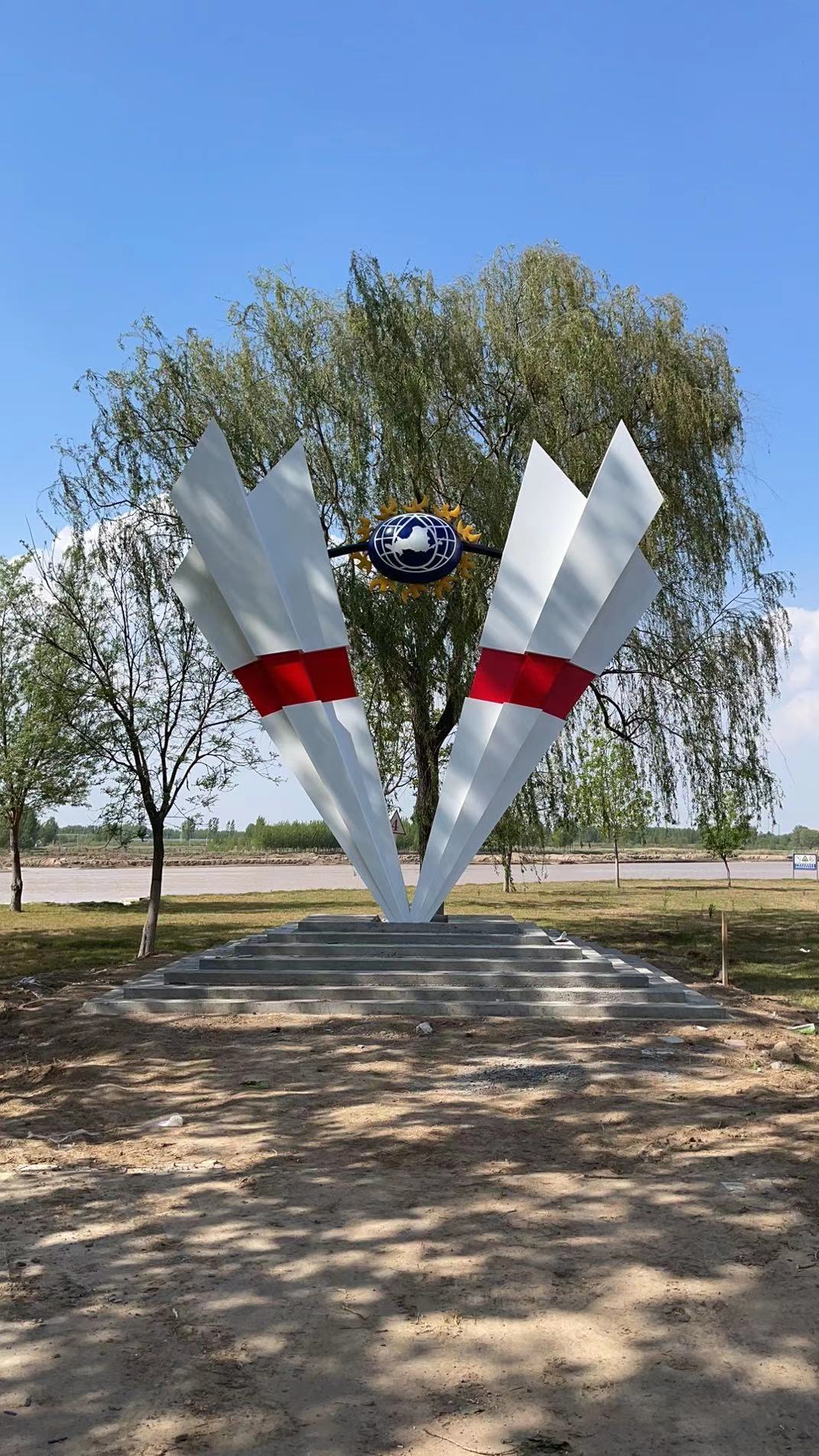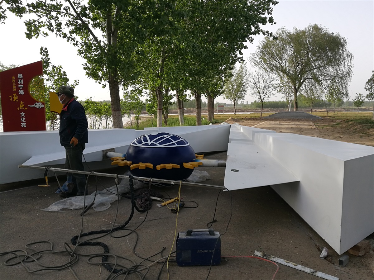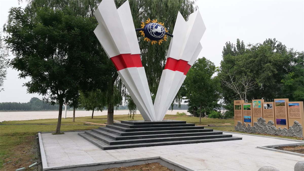 雕塑整體呈扇形構(gòu)造,代表黃河三角洲扇形外貌;兩側(cè)形似利劍,寓意治黃工作者敢于“亮劍”的拼搏精神; 中間球形,寓頂點之意;其上印制有黃河水利委員會標志,圍繞十只和平鴿。寓意以治黃事業(yè)為中心、人民幸福、和平安寧、生態(tài)保護、空間均衡;主體色彩以紅、黃、藍搭配。紅色代表黨建引領(lǐng),黃、藍象征海河交匯。寓意治黃事業(yè)在中國共產(chǎn)領(lǐng)導下開創(chuàng)新篇章。