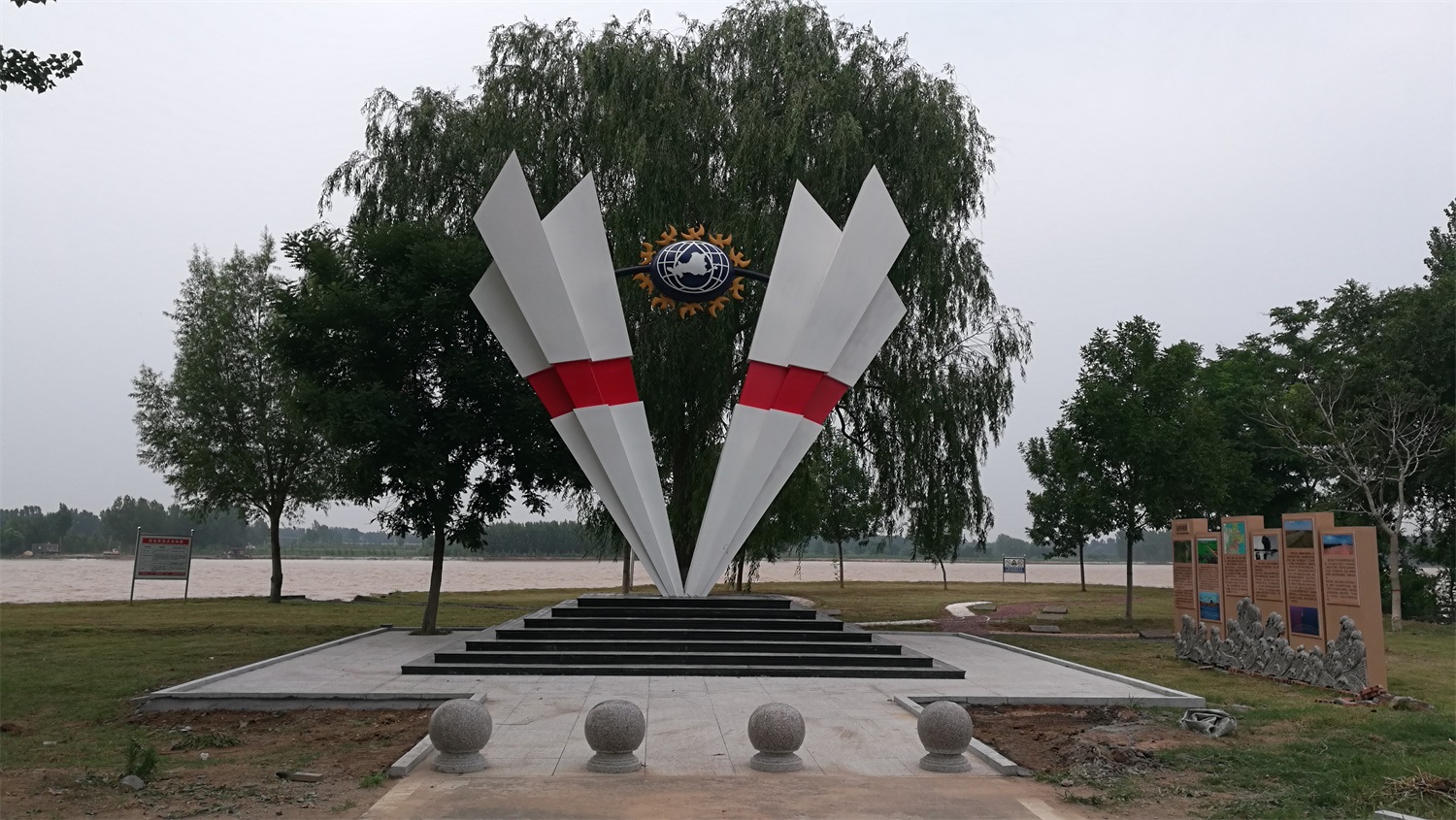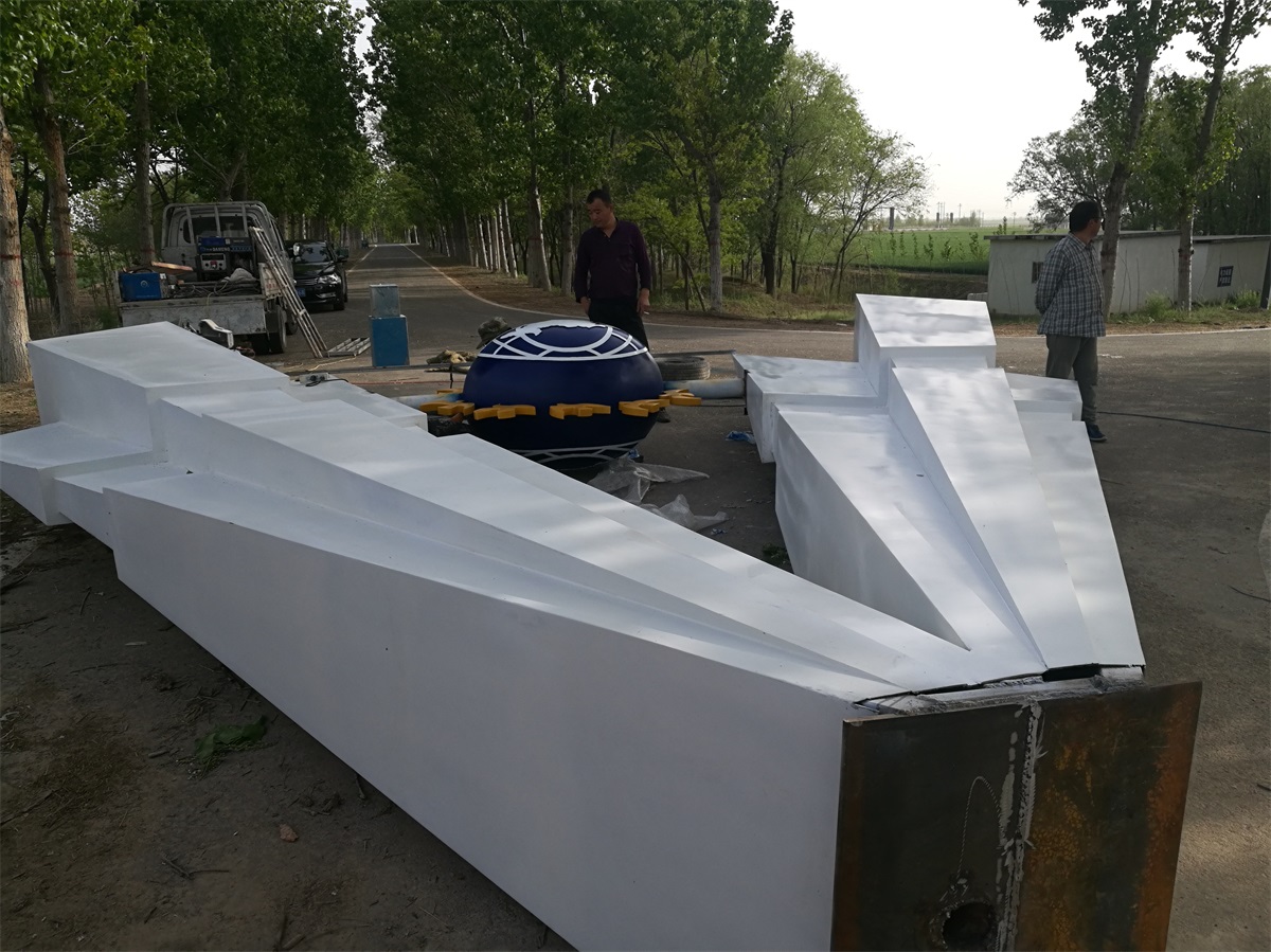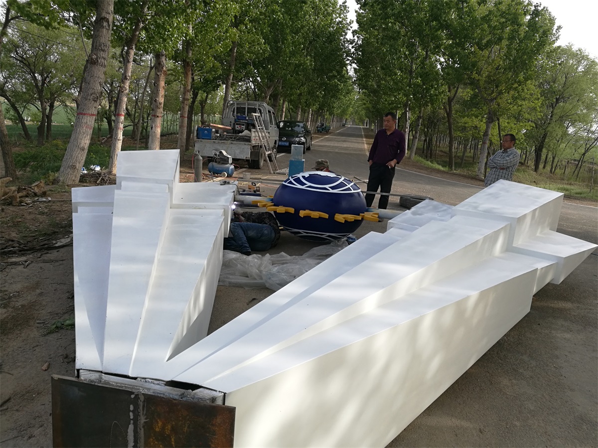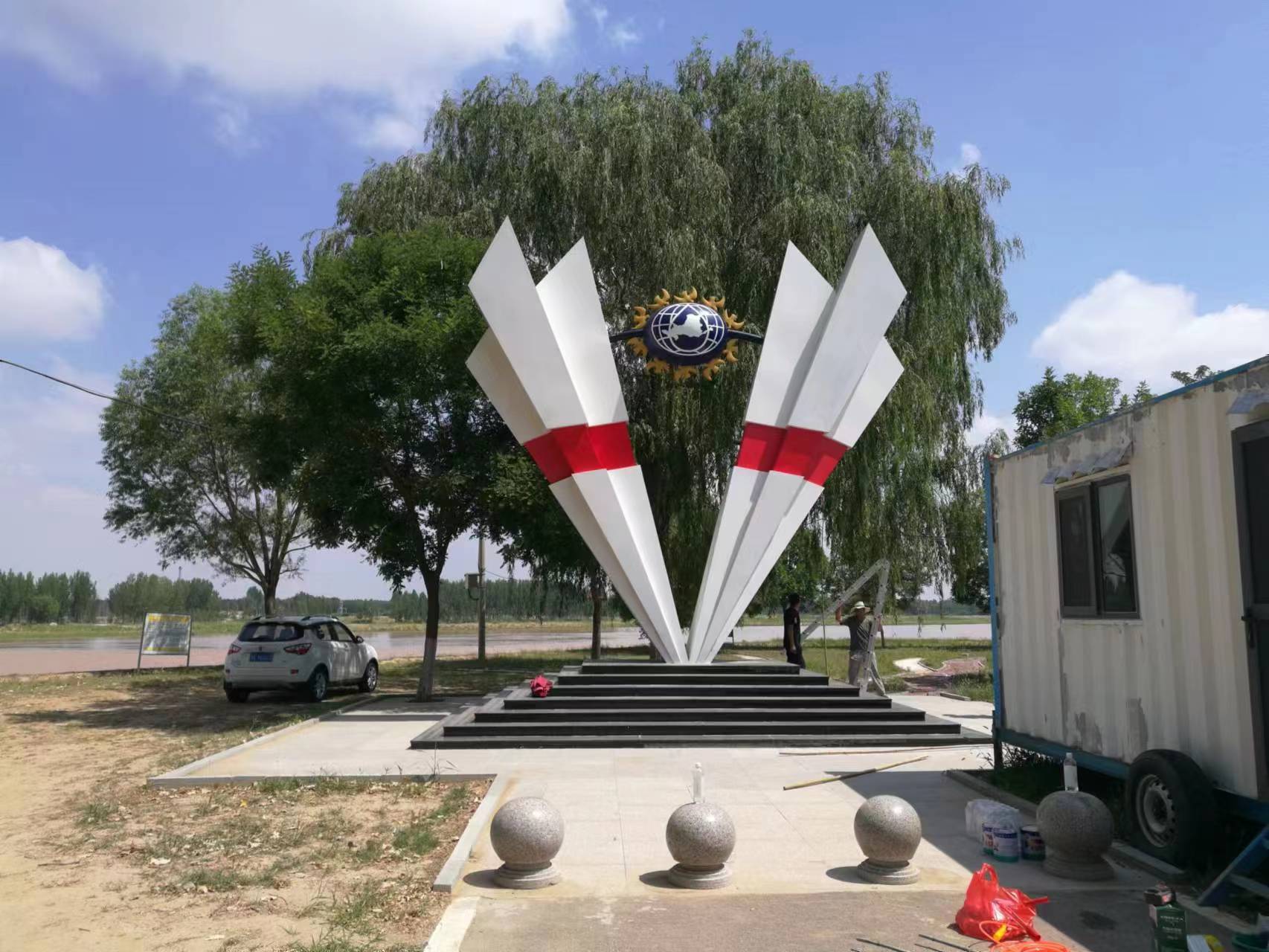 雕塑整體呈扇形構(gòu)造,代表黃河三角洲扇形外貌;兩側(cè)形似利劍,寓意治黃工作者敢于“亮劍”的拼搏精神; 中間球形,寓頂點之意;其上印制有黃河水利委員會標志,圍繞十只和平鴿。寓意以治黃事業(yè)為中心、人民幸福、和平安寧、生態(tài)保護、空間均衡;主體色彩以紅、黃、藍搭配。紅色代表黨建引領(lǐng),黃、藍象征海河交匯。寓意治黃事業(yè)在中國共產(chǎn)領(lǐng)導下開創(chuàng)新篇章。