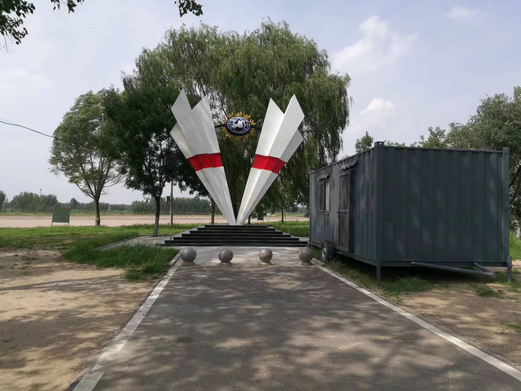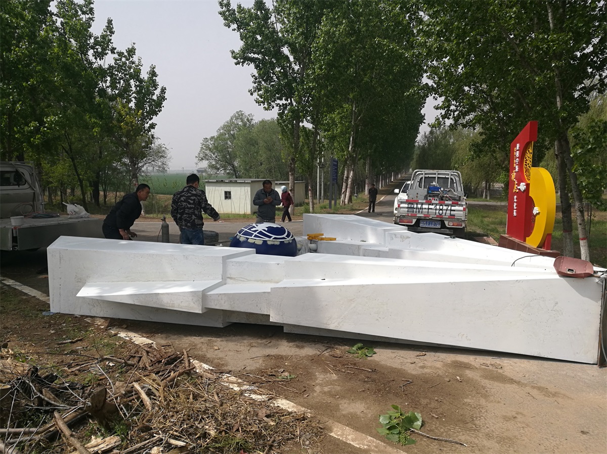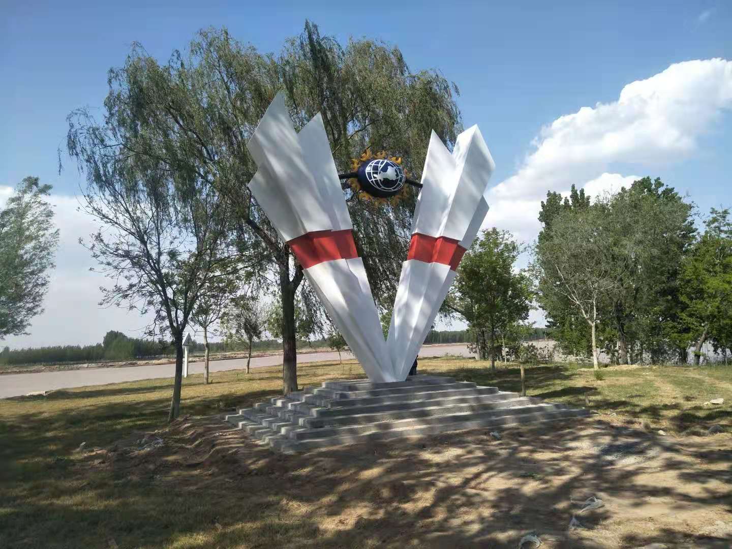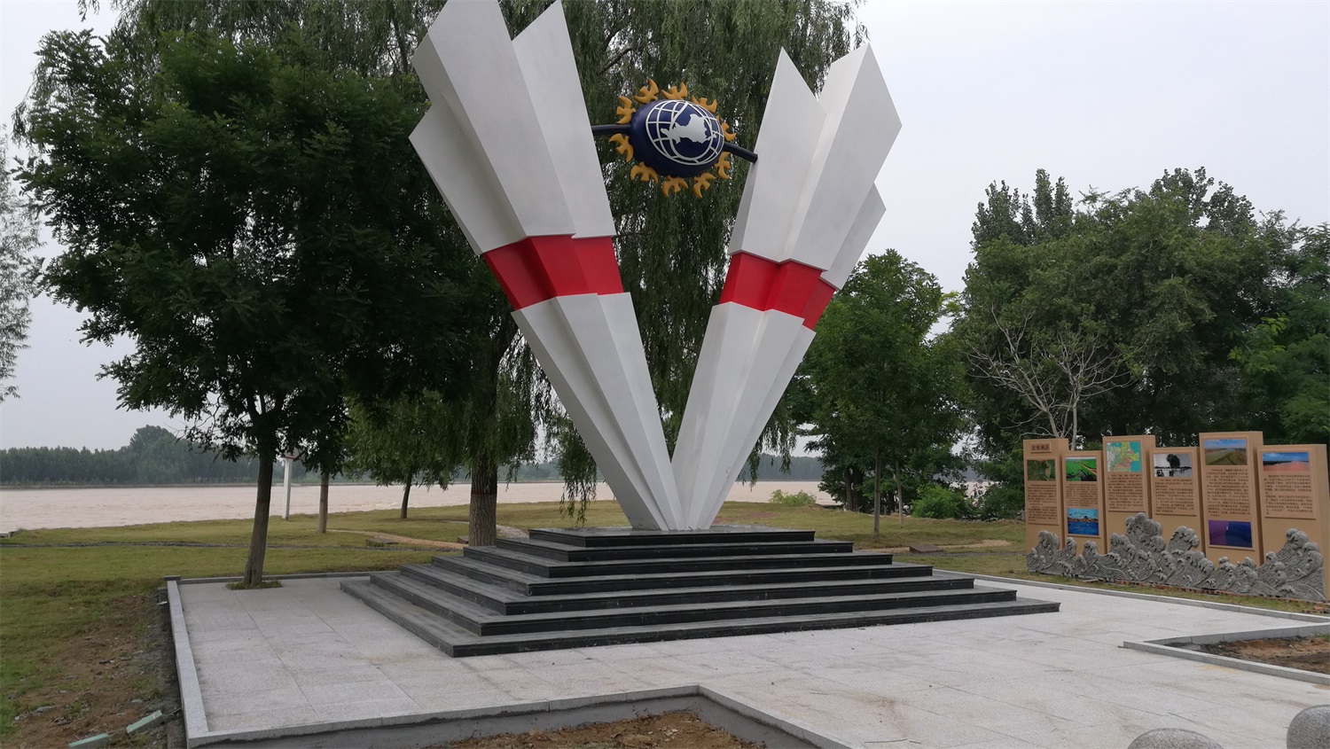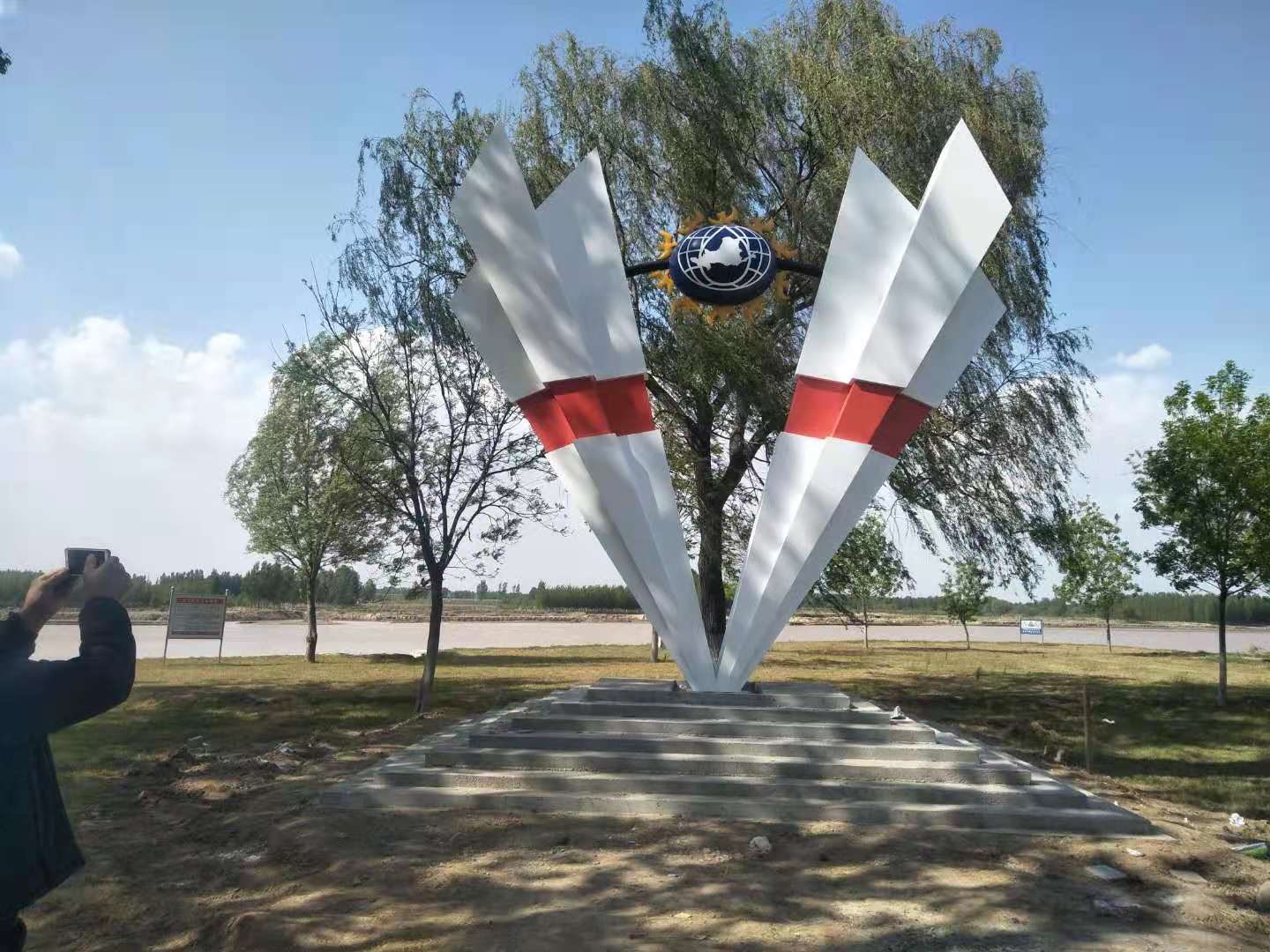 雕塑整體呈扇形構(gòu)造,代表黃河三角洲扇形外貌;兩側(cè)形似利劍,寓意治黃工作者敢于“亮劍”的拼搏精神; 中間球形,寓頂點之意;其上印制有黃河水利委員會標志,圍繞十只和平鴿。寓意以治黃事業(yè)為中心、人民幸福、和平安寧、生態(tài)保護、空間均衡;主體色彩以紅、黃、藍搭配。紅色代表黨建引領(lǐng),黃、藍象征海河交匯。寓意治黃事業(yè)在中國共產(chǎn)領(lǐng)導下開創(chuàng)新篇章。