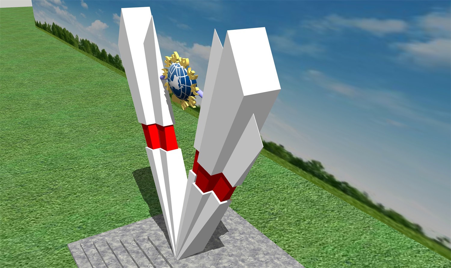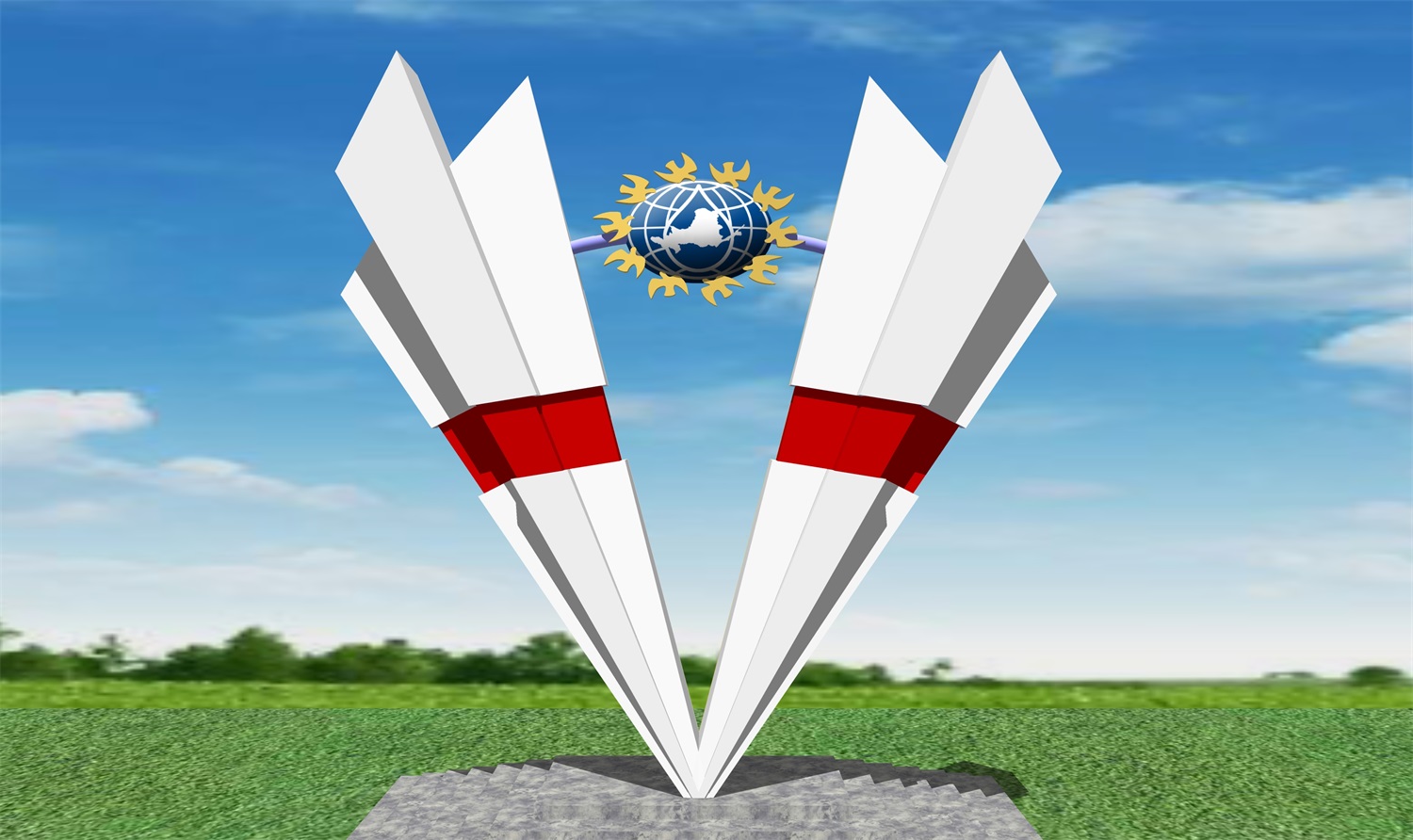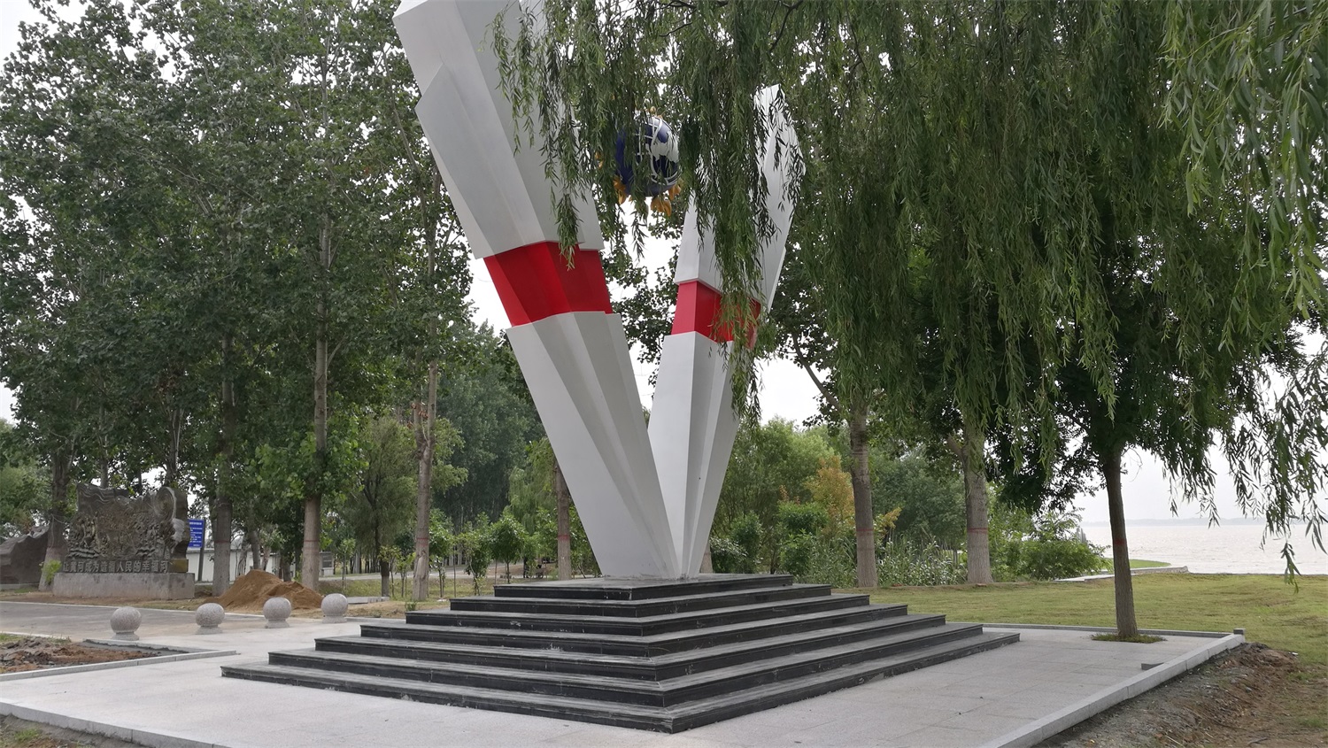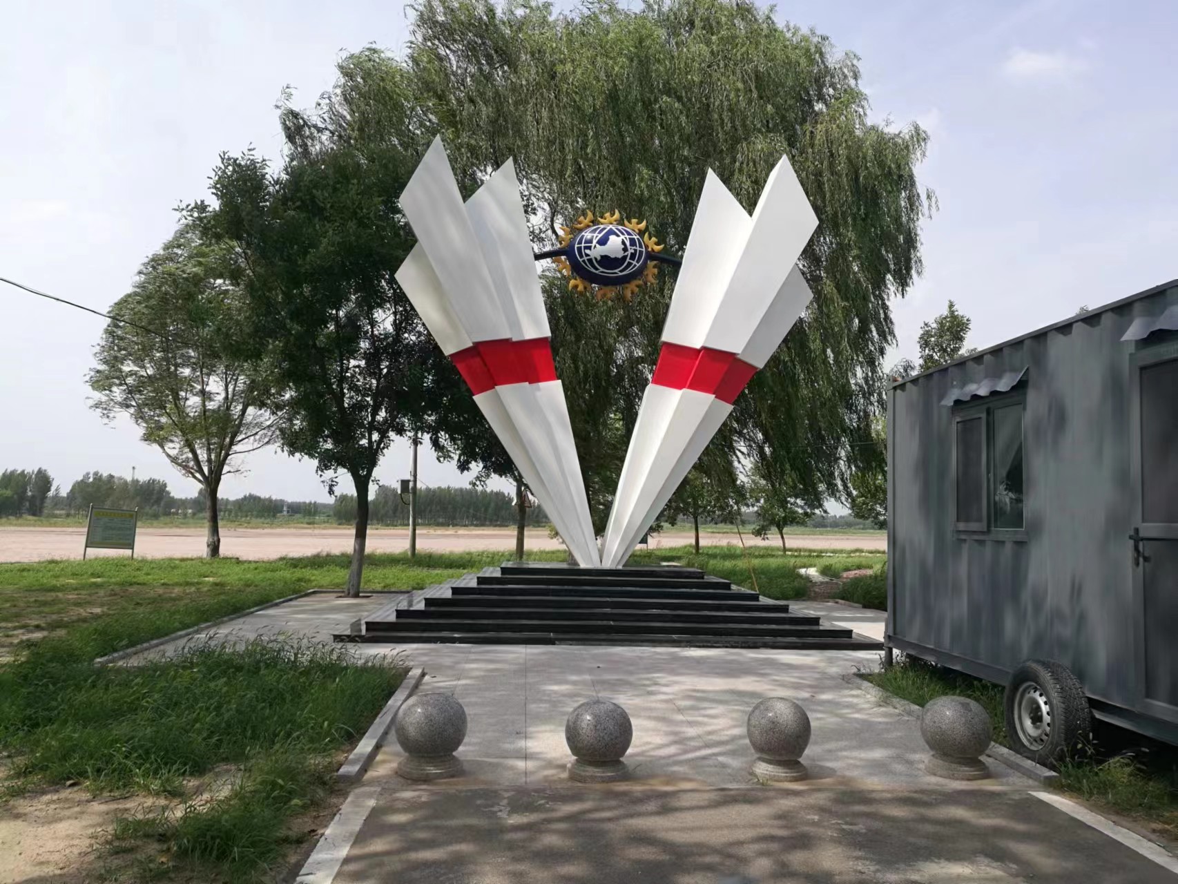 雕塑整體呈扇形構(gòu)造,代表黃河三角洲扇形外貌;兩側(cè)形似利劍,寓意治黃工作者敢于“亮劍”的拼搏精神; 中間球形,寓頂點之意;其上印制有黃河水利委員會標志,圍繞十只和平鴿。寓意以治黃事業(yè)為中心、人民幸福、和平安寧、生態(tài)保護、空間均衡;主體色彩以紅、黃、藍搭配。紅色代表黨建引領(lǐng),黃、藍象征海河交匯。寓意治黃事業(yè)在中國共產(chǎn)領(lǐng)導下開創(chuàng)新篇章。